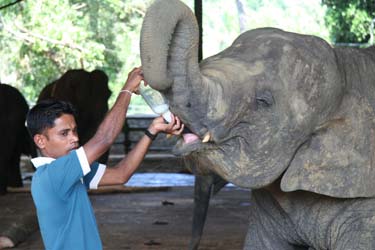 | Ensuite, visite de l'orphelinat des éléphants à Pinnawela. Ce sont des éléphants qui ont été retrouvé seuls, malades ou mourant de faim. Ils sont alors soignés et nourris puis remis en liberté. | ![]() |