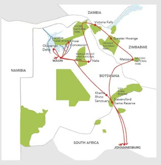 Ce voyage s'effectue de Johannesbourg à Johannesbourg en 16 jours. Vous avez la possibilité de n'en faire qu'une partie, en 9, 12 ou 13 jours, vous épargnant les longues traversées du désert du Kalahari mais nécessitant de prendre un vol régional jusqu'à Johannesbourg.